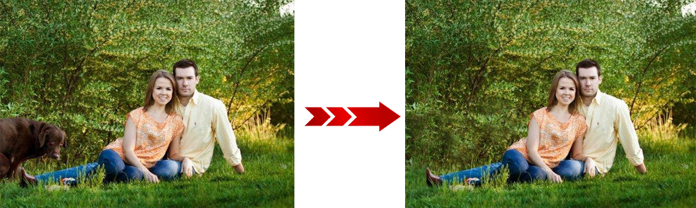 | Ćwiczenie 3 - Wczytaj do iPiccy zdjęcie pies.jpg i usuń z niego psa (podobnie jak na zdjęciu po prawej).Zapisz efekt pod nazwą "pies" w swoim folderze "Grafika2". |