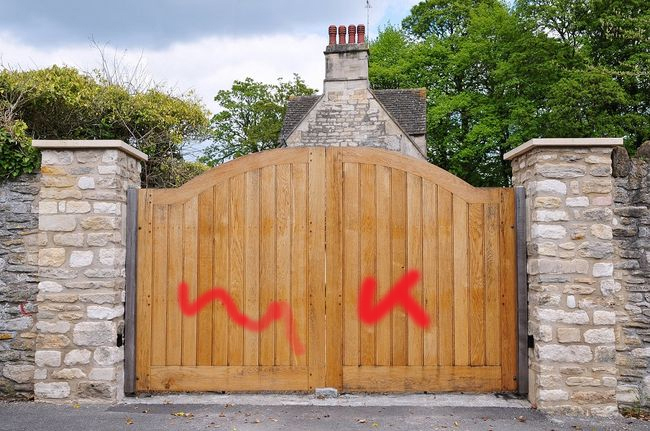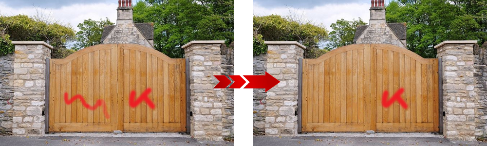 | Ćwiczenie 5 - Wczytaj do iPiccy zdjęcie brama.jpg i usuń z niego przynajmniej jeden czerwony napis (podobnie jak na zdjęciu po prawej).Zapisz efekt pod nazwą "brama" w swoim folderze "Grafika2". |