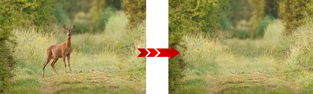 | Ćwiczenie 1 - Wczytaj do iPiccy zdjęcie sarna.jpg i "usuń" z niego sarnę (podobnie jak na zdjęciu po prawej).Zapisz efekt pod nazwą "sarna" w swoim folderze "Grafika2". |