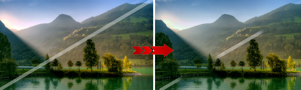 | Ćwiczenie 6 - Wczytaj do iPiccy zdjęcie widok.jpg i usuń z niego przynajmniej fragmenty prześwitującego paska (podobnie jak na zdjęciu po prawej).Zapisz efekt pod nazwą "widok" w swoim folderze "Grafika2". |