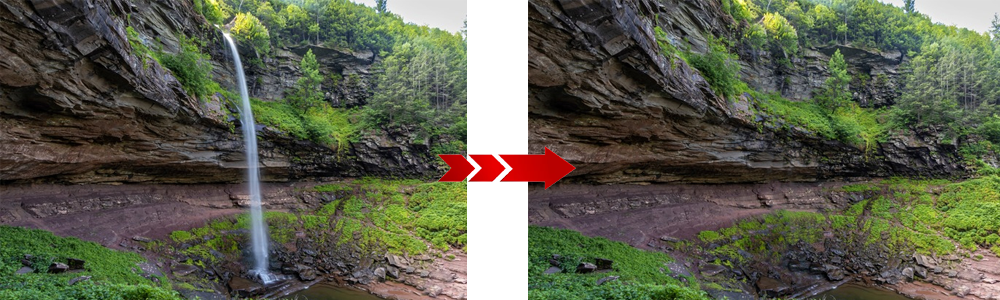| Ćwiczenie 2 - Wczytaj do iPiccy zdjęcie wodospad.jpg i usuń z niego wodospad (podobnie jak na zdjęciu po prawej).Zapisz efekt pod nazwą "wodospad" w swoim folderze "Grafika2". |