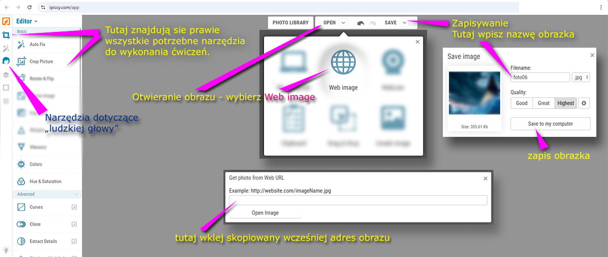 Po przejściu do iPiccy wybierz OPEN i Web image (zobacz rysunek poniżej).